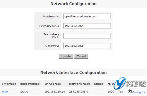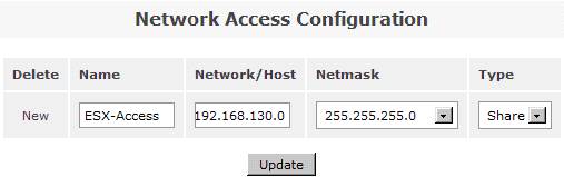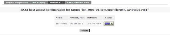 在系統菜單“System”菜單下的“Network Access Configuration”區(qū)域,配置允許訪問 Openfiler 系統的安全訪問控制列表。值得注意的是只有加入到 Openfiler 的網絡訪問控制列表中的網絡或者主機地址,才允許訪問 Openfiler 系統所提供的虛擬存儲服務。在網絡訪問控制列表中,既可以配置網段地址也可以配置單個主機地址。在本例填入 192.168.130.0 網段,設置類型為“Share”方式,添加完成后點擊“Update”完成系統配置更新。如圖