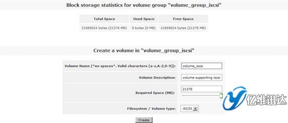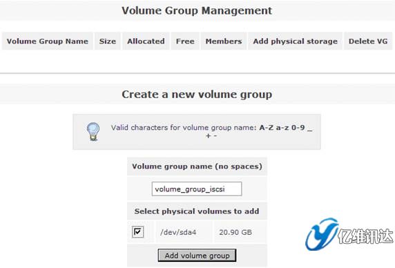 接著在右側的“Volumes section”區(qū)域選擇“Volume Groups”來創(chuàng)建一個卷組。在區(qū)域“Create a new volume group”處填寫卷組 volume group 的名稱為“volume_group_iscsi”,同時勾選剛剛在上一步所創(chuàng)建的物理卷 /dev/sda4,最后點擊“Add volume group”。如圖