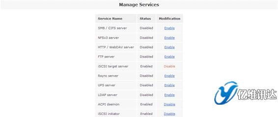當 iSCSI 卷創(chuàng)建完成后,接下來是開啟“iSCSI target server”系統服務。點擊“Services”菜單,在右側的“Services section”區(qū)域選擇“Manage Services”。然后將系統服務列表中的“iSCSI target server”設置為“Enabled”狀態(tài),從而使得系統能夠對外提供基于 iSCSI 協議的虛擬存儲服務。如圖