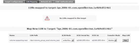 接下來點擊“LUN Mapping”子菜單,保持其余默認選項,點擊“Map”選項。從而實現從 LUN 到剛剛配置好的 iSCSI Target 之間的映射。如圖