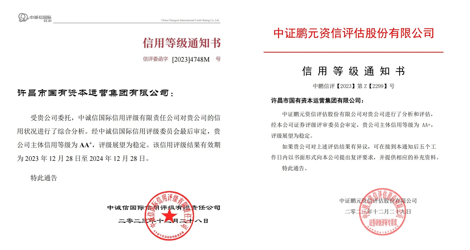 2023年12月28日、12月29日,經(jīng)國內(nèi)權(quán)威評級機(jī)構(gòu)中誠信國際信用評級有限責(zé)任公司、中證鵬元資信評估股份有限公司專業(yè)評定,許昌市國有資本運(yùn)營集團(tuán)有限公司先后獲得AA+主體信用評級,評級展望為穩(wěn)定。